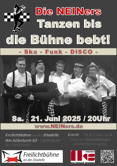 Samstag, 21.06.2025 – 20:00 Uhr Wo?Freilichtbühne an der Zitadelle Eintritt:15,- € / Erm.: 12,- €Tickets gibt’s auch online Veranstalter: https://kulturhaus-spandau.de/ev_event/ska-funk-disco/ Tanzen bis die Bühne bebt! Die NEINers sind die Band, die die Musikgeschichte auf den Kopf stellt! Mit ihrem einzigartigen Twist werden Hits neu interpretiert und oft in mitreißende Ska-Beats verwandelt. Was die NEINers aber von anderen Coverbands unterscheidet, ist vor Allem die unbändige Energie, die sie auf der Bühne versprühen. Die Band feiert nicht nur die…